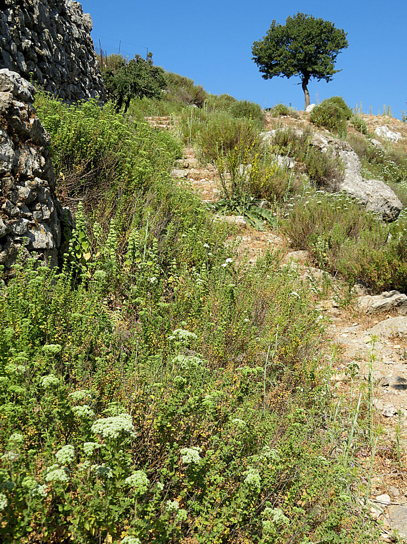 Predominant is the white of the oregano, tens of thousands of bees from hives both local and shipped in garnering the pollen. They make traversing many of the footpaths a bit nerve racking, hoping they don’t regard you as a threat. Key is to stay away from the hives. Topping the steep climb up to the monastery of Panagia Hamon, the path leads straight through about 20 hives. Suspecting they were there, I went off to the right before reaching the threshing circle where they are clustered but was still buzzed many times, bees colliding with my head to make the point. I took my time over the climb, partly to not overdo things in the heat, partly to repair some of the directional stone markers on the confused path.