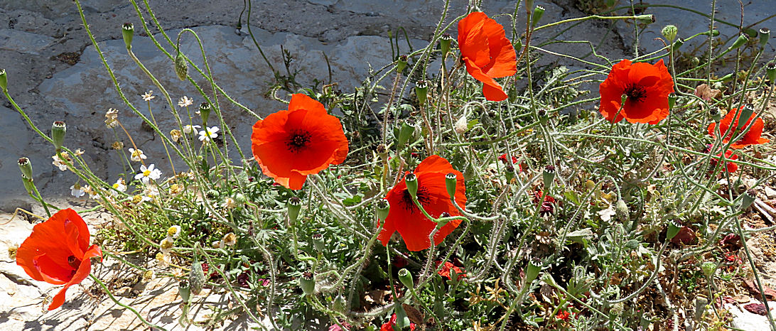 Most dramatic are the poppies. A fresh flowering every morning, petals dropped by evening as temperatures rise and their flowering comes to an end.