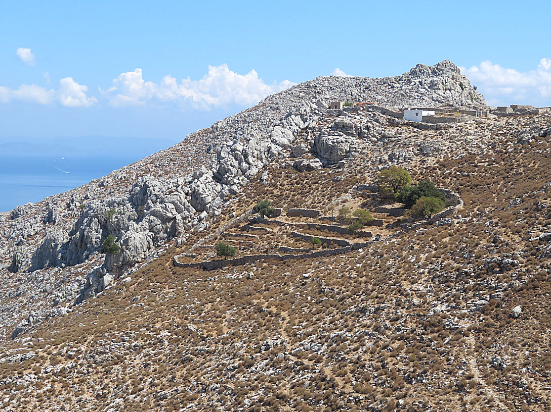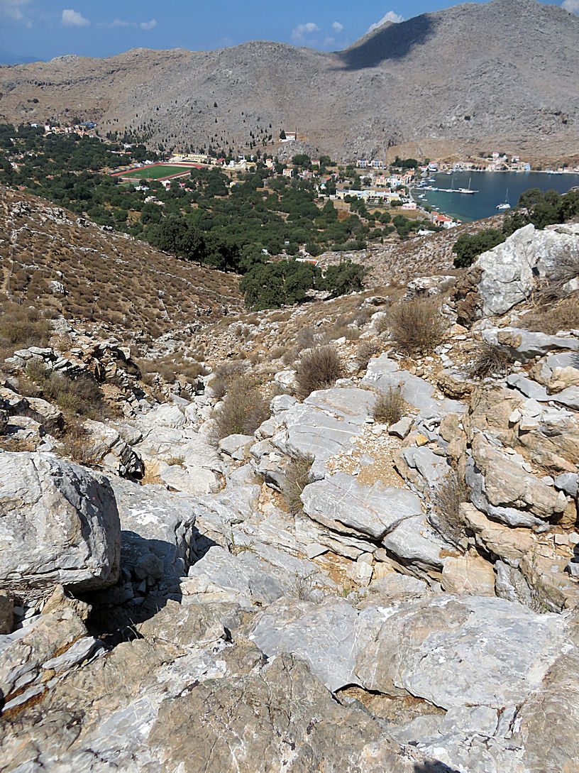 The first part of the walk is easy. Go up ‘The Tarmac’, the road towards Panormitis Monastery at the other end of the island, and turn left at the second hairpin bend out of Horio at the Agia Marina Cemetery. A rough bulldozed track when we first came here in 2000, from the new bridge behind the cemetery the road is now concreted. In places it’s steep but easy walking with views across the Pedi valley to Horio and the ridge-top windmills and down to sheltered Pedi Bay on one side and steep rocky outcrops on the other.