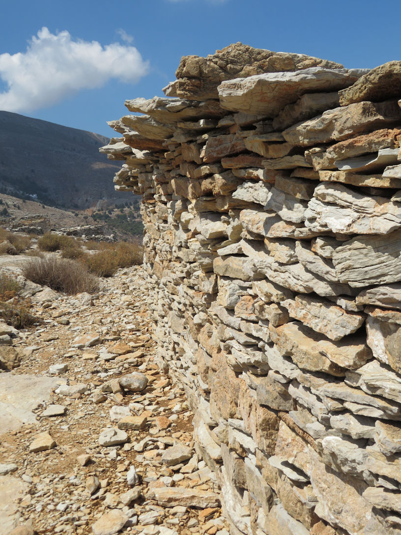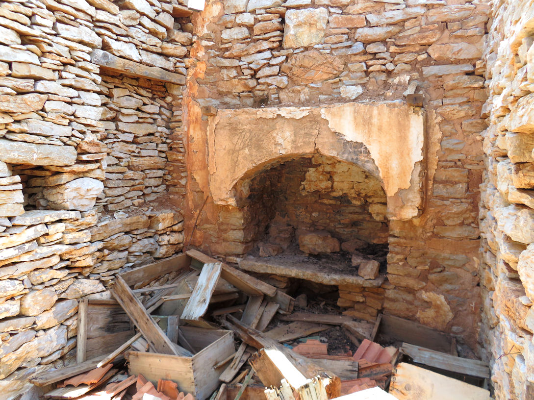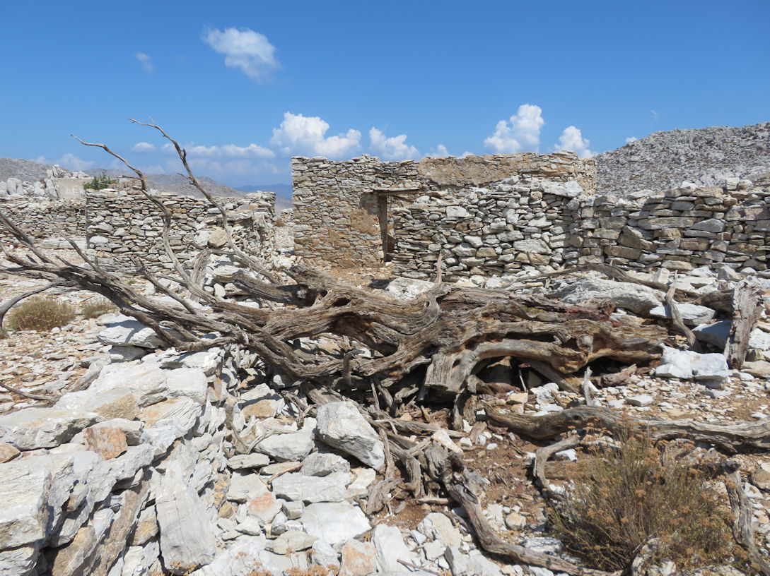 Houses survive, some with roof intact unlike Micro Horio on Tilos where the residents left en masse and took their rooves with them. The communal bread oven is still there. A couple of the houses are locked, one recently renovated, still used as day-bases by farmers. One has a partly collapsed roof but inside the fireplace and remains of the sleeping platform survive amidst abandoned and broken beehives. Enclosure walls survive with projecting slabs on top to keep out goats.