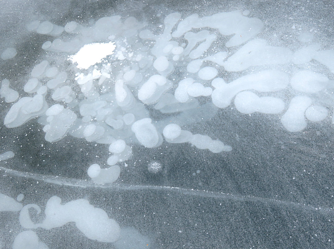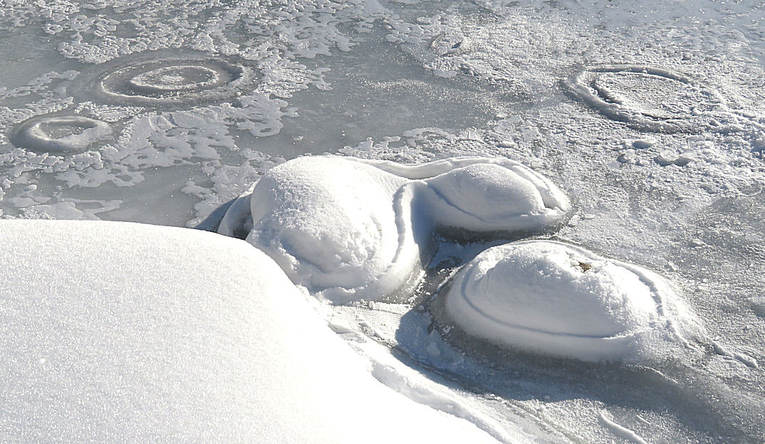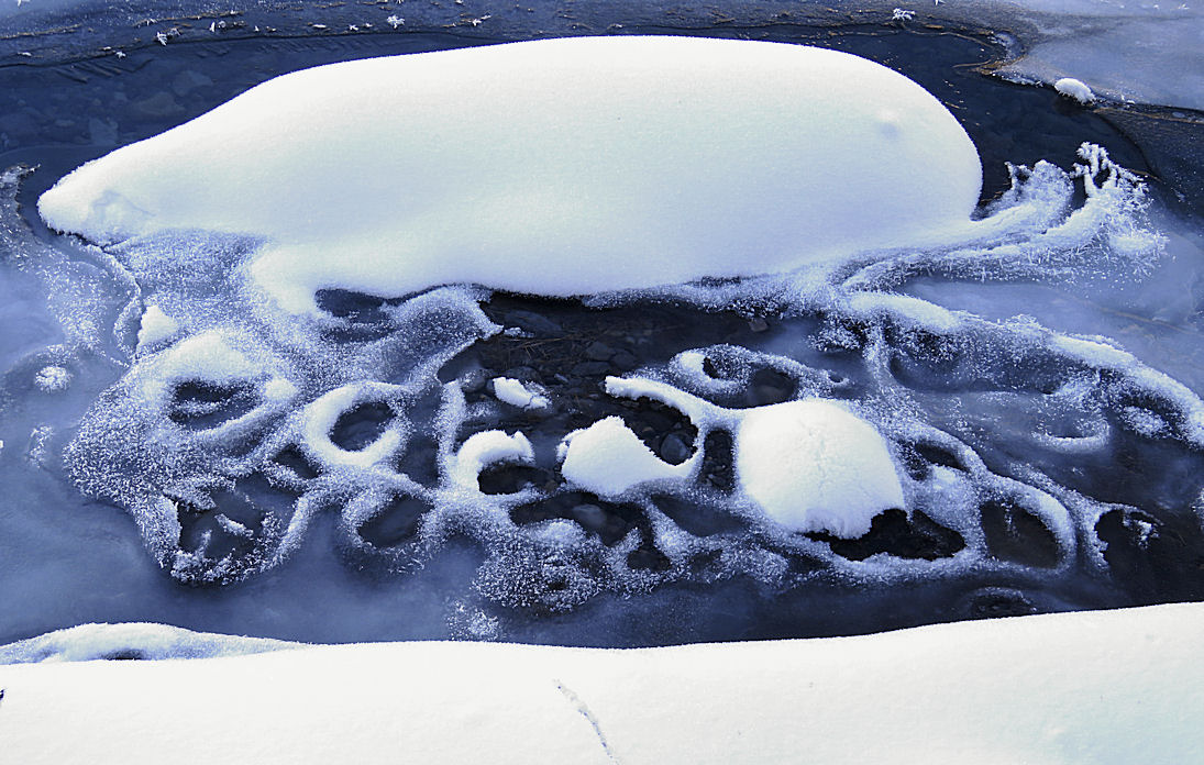 Something which struck me last winter was the incredible ‘art’ created by the ice on rivers and lakes. This year the same. When flowing water freezes it makes unexpected shapes, sometimes long tendrils, sometimes swirls, emphasised by the fresh snow. Gases bubbling up from the riverbed create frozen ‘mushrooms’.