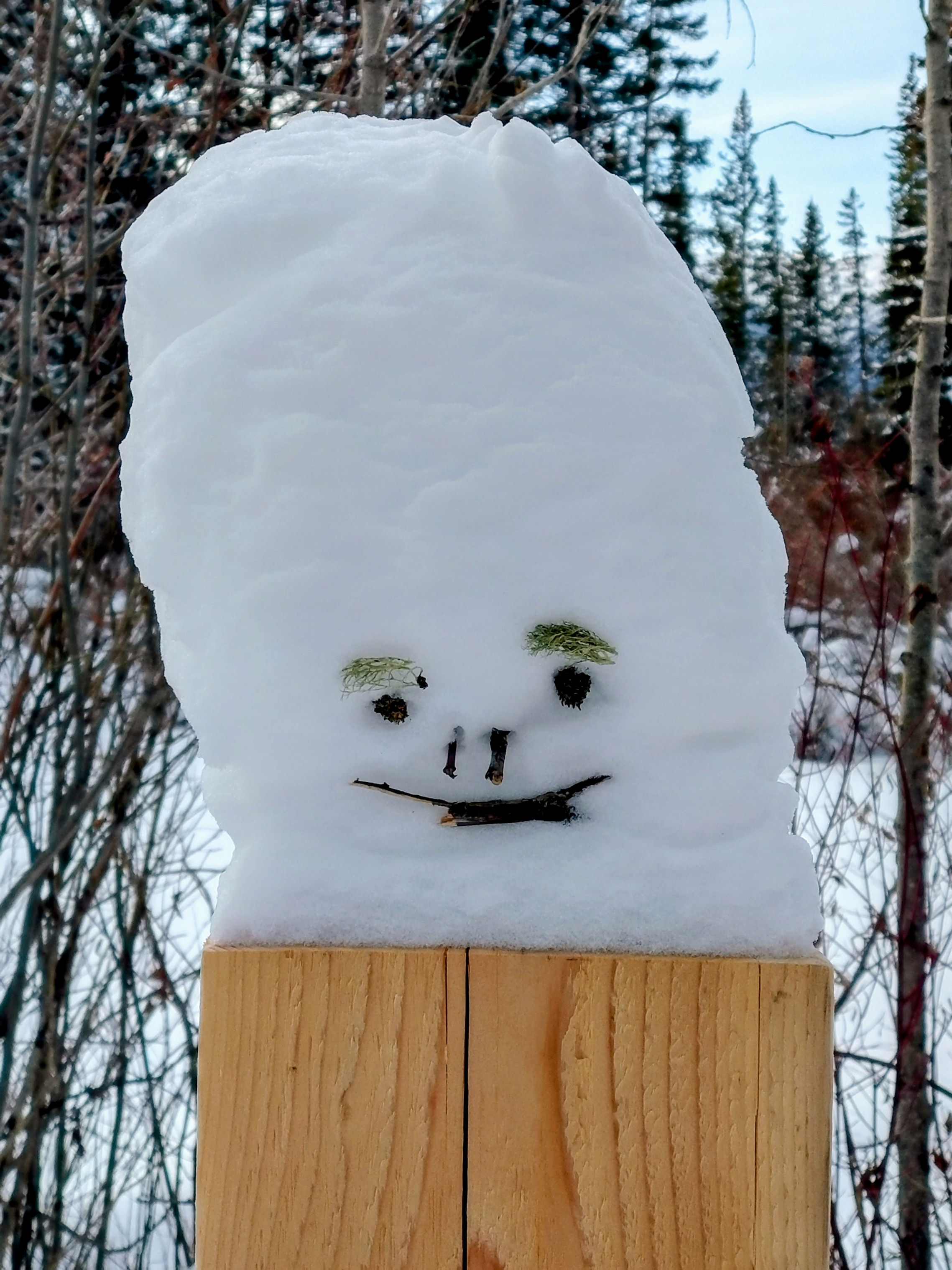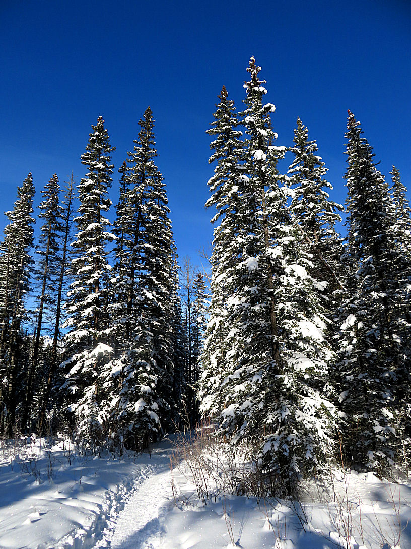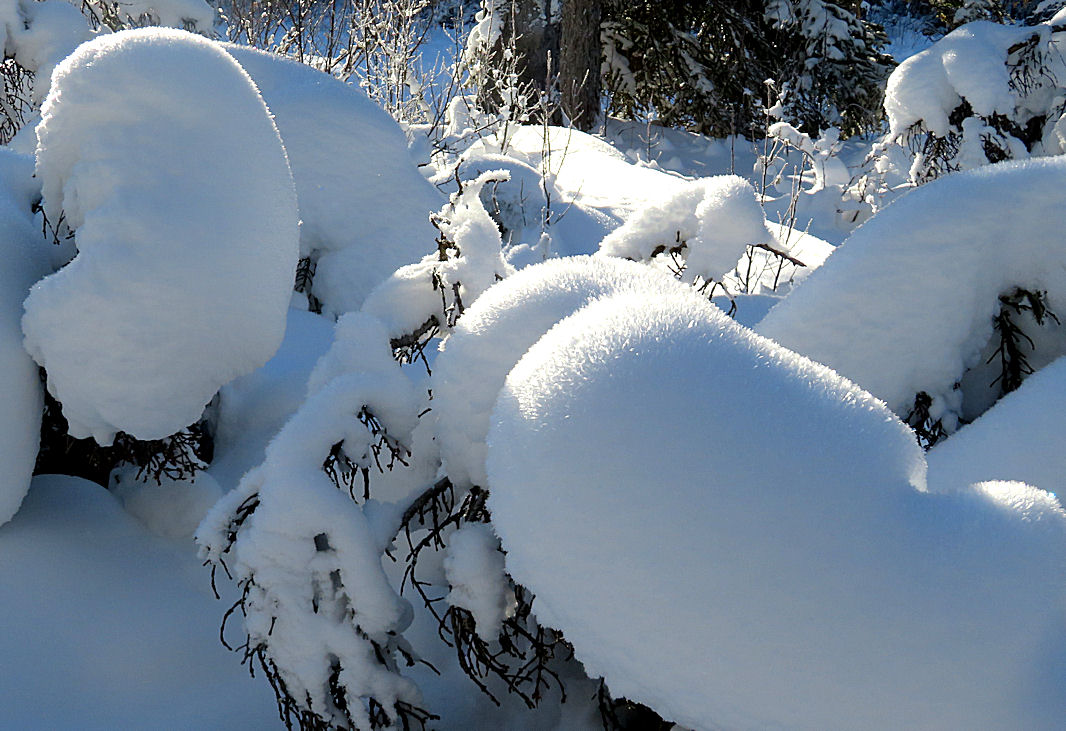 In the back-country, trees were heavily laden with snow, branches bowing down. Shaped by the wind, curving mounds covered fallen trunks and new growth. Away from the trails where the snow had compacted, snowshoes were essential to avoid sinking in halfway up your calves.