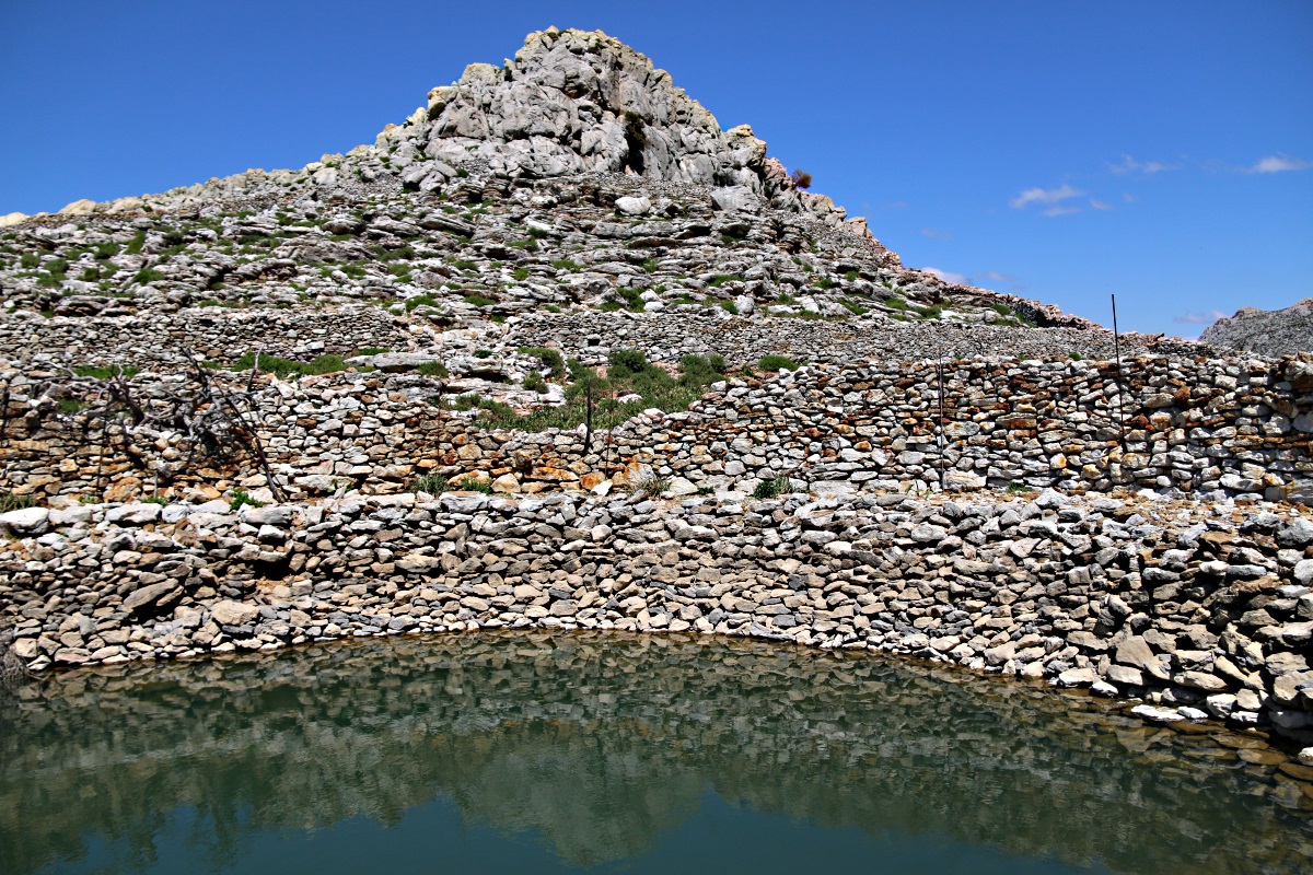 Over the last few years the water level in the pond has been dropping alarmingly. October 2014 it was the lowest I have seen it, reduced to a small area with mud-flats at the side and what looked like the opening of a cave system below water level. This is likely given that there is no way that the pond is maintained by surface run-off. My guess is that the aquifer which feeds it originates in Turkey, just across the narrow channel. This may be supported by the fact that this year the water level continued to rise after 2 weeks without rain on Symi.