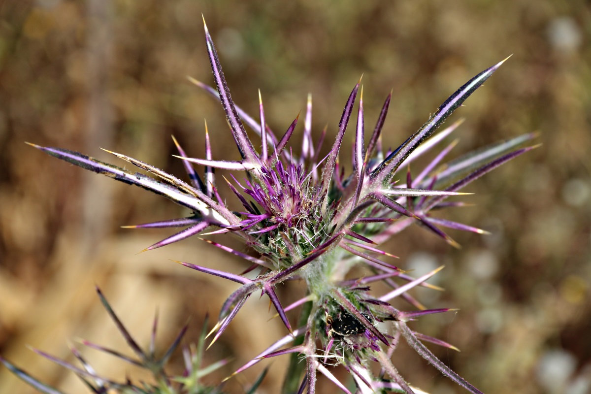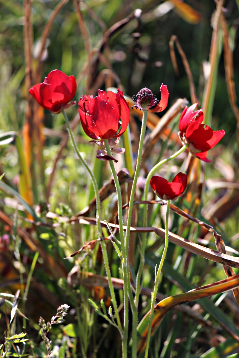 The first part of the route from the top end of Horio and onwards from the Agia Marina cemetery is along a now-concreted track much of it bordered closely on the downhill side by 2-metre high chain-link fence. In Spring there is a marked contrast between the fenced and the unfenced land. The latter is stripped bare by foraging feral goats, vegetation confined to oregano now ready to burst bud, Dragon Arums unfurling everywhere, and the drooping yellow foliage of last Autumn’s stately squill. By contrast, behind the fences are Crown Daisies in their million, tall grasses and wild cereals, yellow headed Vipers Grass (which is neither a grass nor anything to do with vipers), spindly cornflowers, opulent pink convolvulus, the red splash of poppies, occasional wild gladiolus, and great yellow cushions of Greek Spiny Spurge, the bright yellow flower-heads hiding a vicious mesh of needle-sharp spines.