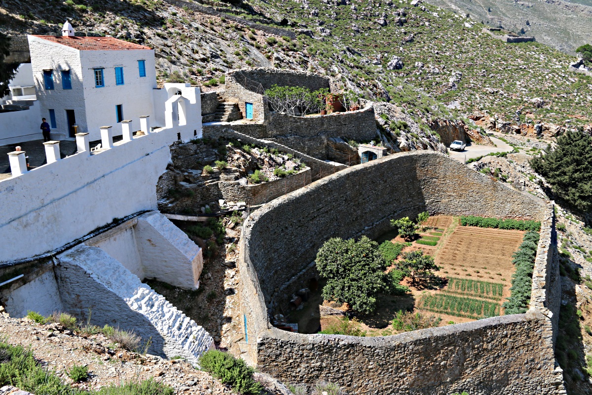 At the end of the track the monastery of Zoodohou Pighis Vrisi marks the edge of civilisation. Small annual festivals are held here on 17 April and the walled gardens are carefully and regularly tended, no chemicals used only manure and compost. The spring which emerges from a gated cave behind the buildings and which gave the monastery its name as well as its location, is used to water the gardens and is piped to a tap in the courtyard. It’s also piped to Horio in 6-inch diameter black polyethylene draped on the surface alongside the track thus ensuring that it is heated by the time it comes out of the cold taps in the village and is completely undrinkable .